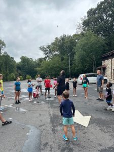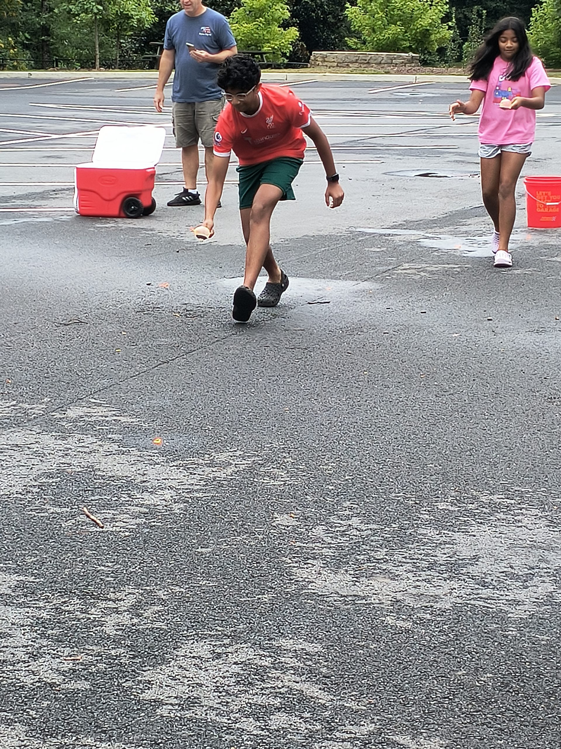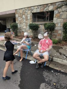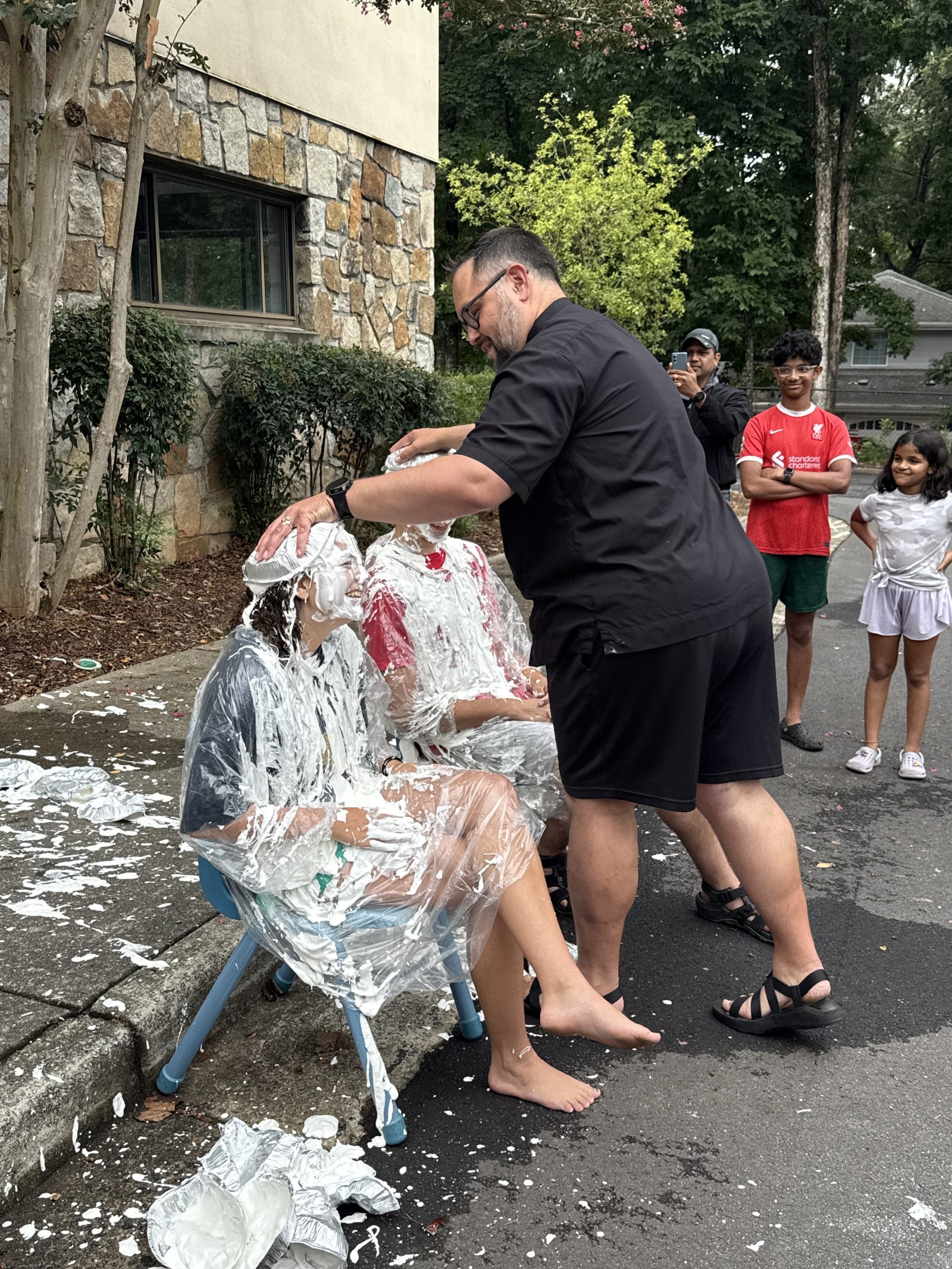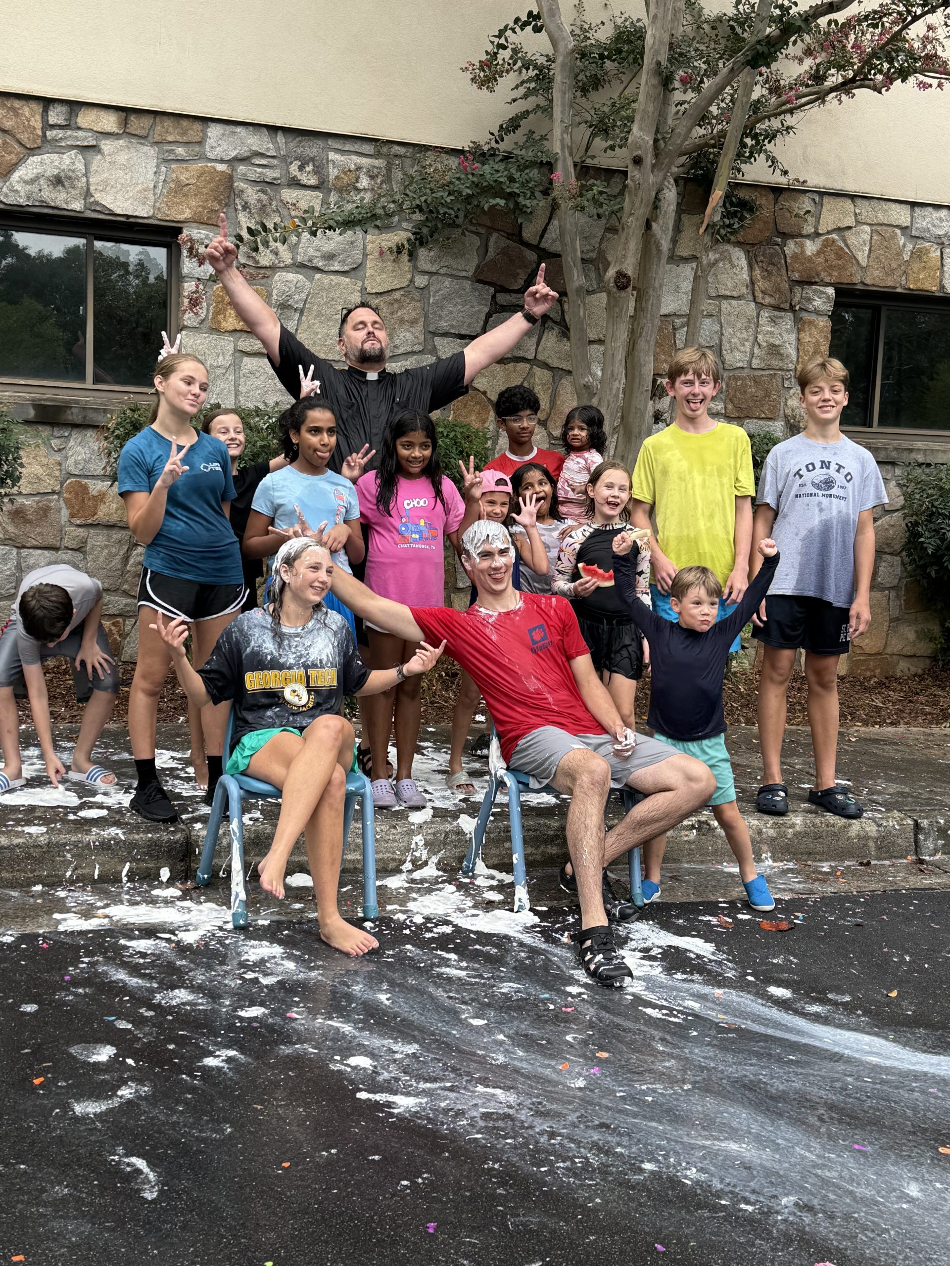 Mass coverage can be a challenge in the busy summer months when families travel and engage in many activities. We challenged our altar servers to achieve high percentages of coverage even in the summer, and they rose to the occasion. Their efforts earned them a special event the day before the 25-26 DeKalb County school year started, featuring water balloon games and a water fight with Fr. Michael and the chance to pie our two senior Guardian level altar servers. (Seda Barranco and Joshua Estes have trained many of our young servers, so this was payback time for any bossiness they’ve exhibited!).